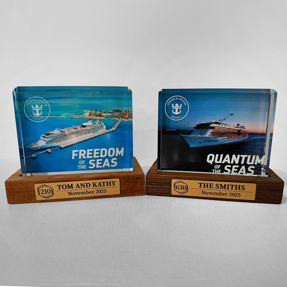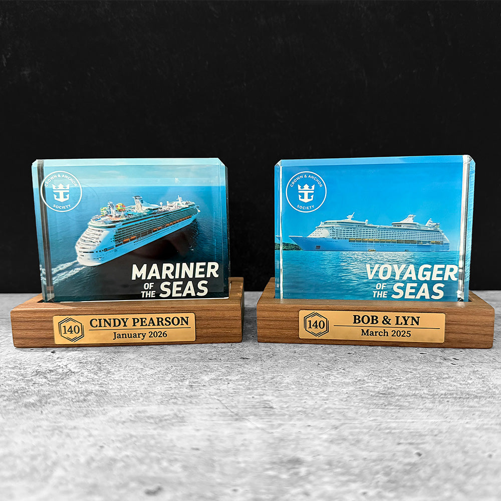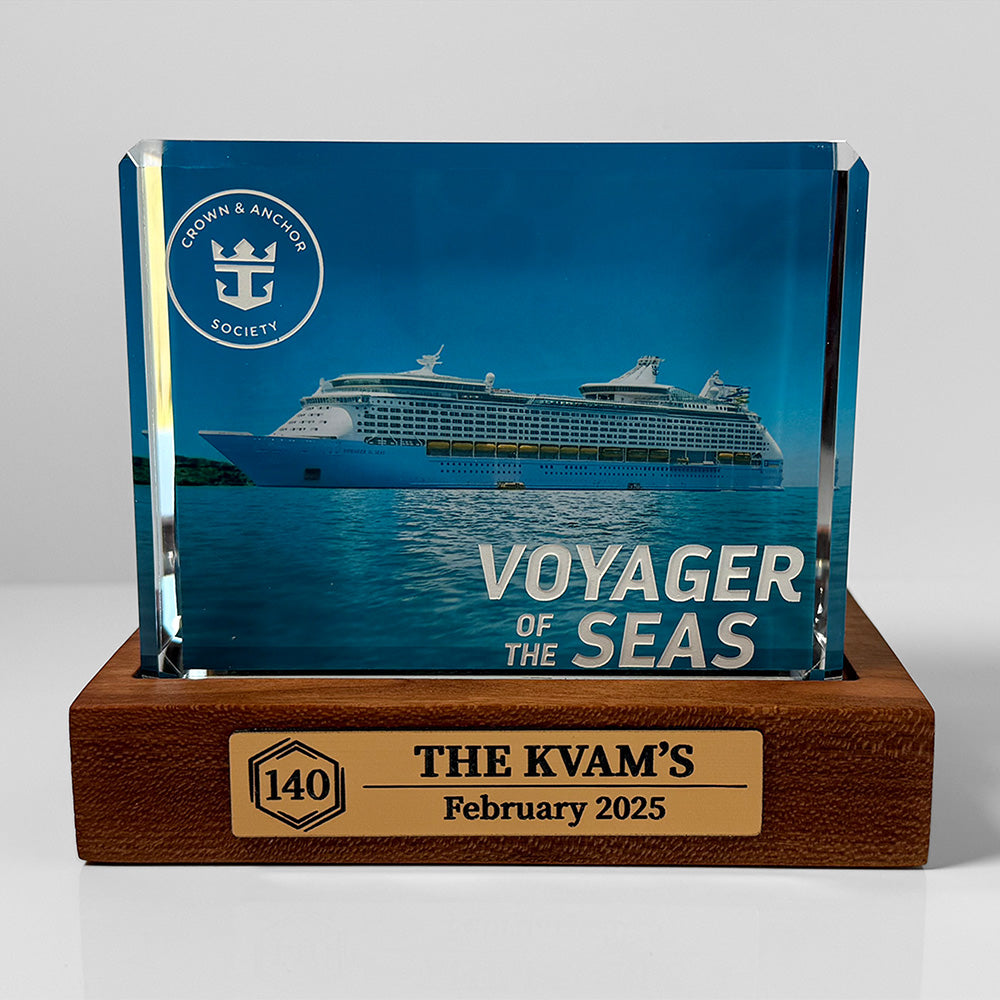 Made from solid hardwood and dark brown leatherette, this unique item celebrates the significant Royal Caribbean’s Crown & Anchor® milestones in your cruising life by displaying your ship's crystal blocks in a luxurious way. The hardwood sturdiness ensures that it can withstand changing temperatures and humidity, while the leatherette adds an extra touch of sophistication that brings lasting beauty to any room.