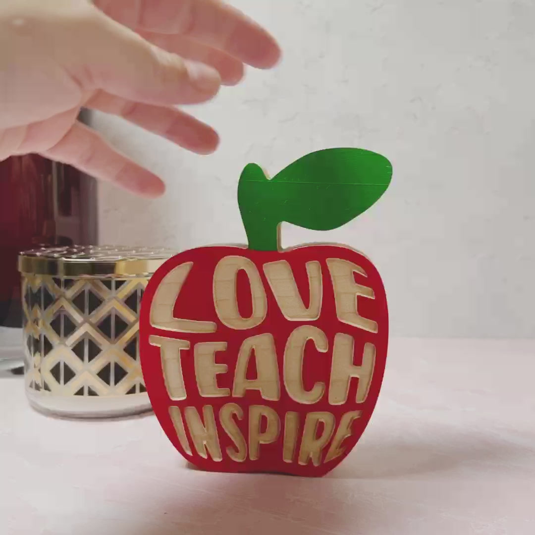 This cute standing apple sign is made from Hard Maple and engraved with the phrase "Teach Love Inspire." It makes a great addition to any room in your home, office, or classroom. The sign measures approximately 6" x 5" and is almost an inch thick, making it the perfect size for any space. We make them out of hardwood, obtained from sustainable sources, to ensure its strength and durability, with a kiln drying process that allows for a beautiful finish.